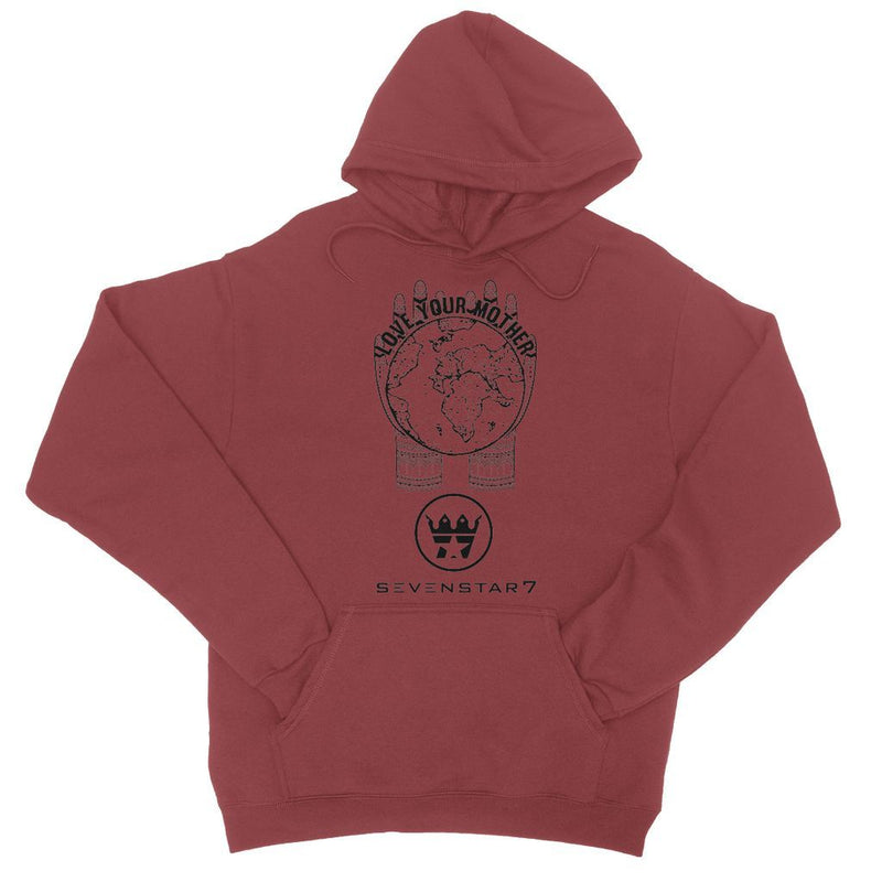 Classic college hoodie with print. The front pocket has a hidden opening for earphone cord feed. Available in a range of great colors with a double-layered hood, self-colored cords, and ribbing to cuff and hem. Cotton & polyester mix